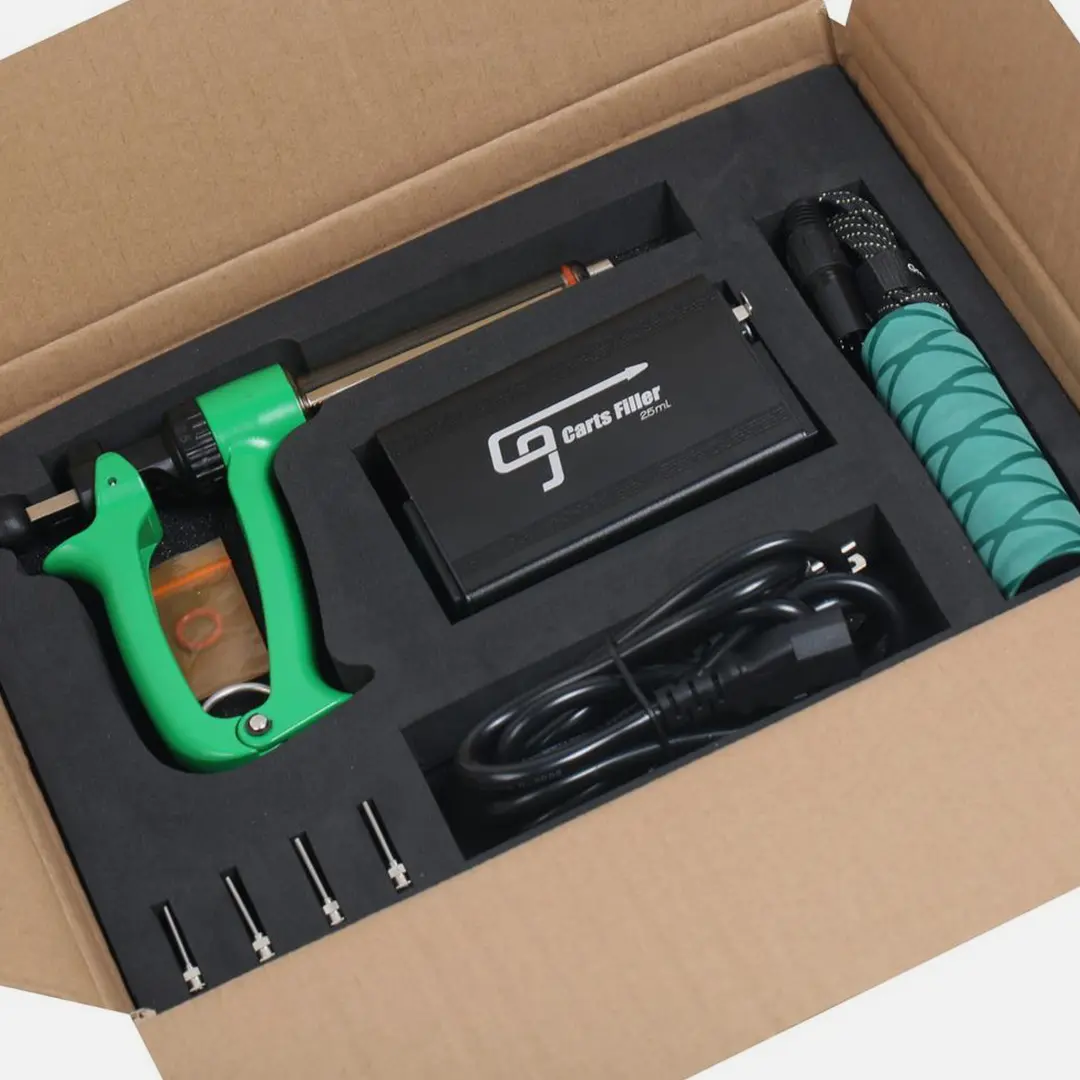 The Semi Automatic Cartridge filling gun. You can quickly and accurately fill your cartridges. The heated barrel has a digital controller that allows the user to set a temperature from (Room Temperature – 190°F) in increments of 1.0°F. The Filler comes ready to use, just plug it in and attach the included 14 Gauge Tip & 18 Gauge Tip (by default)